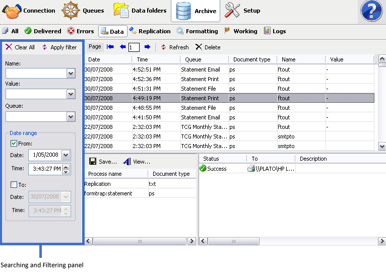 filtering panel, specify searching criteria to retrieve