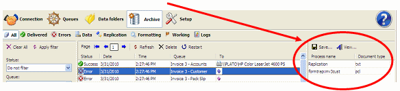 FTSpooler keeps all the job processing and delivery information in one job archive and provides different views, i.e. All, Delivered, Errors, Data, Replication, Formatting, Working and Logs.