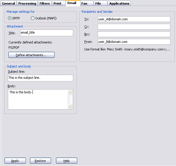 Email is activated using Associated File entries with or without default options overridden by the