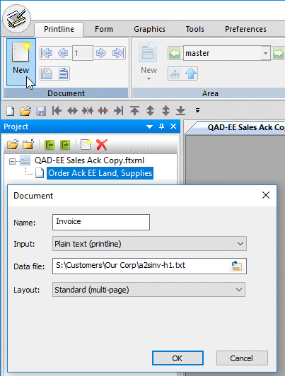 Projects contain at least one to multiple Documents. A single input data file may generate many different documents. Documents are identified by their individual Master Rules together with their order in the Project window. This allows different formatting (for example, Internal POs vs External POs) as well as handling of many different documents.