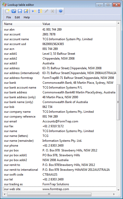 List entries may be used to substitute longer texts in the output form, in the same way as the Company Name substitution. If lookup entries exist they will generally be named as FieldName-list value. This means you can add a new entry to a list, then also enter a lookup substitution for the new list entry.
